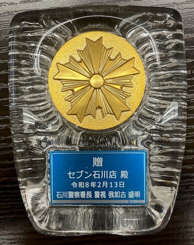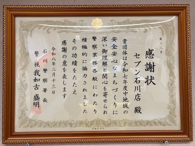 石川警察署より感謝状をいただきました 2026.02.19 2026年2月13日、警察業務への理解と警察活動への協力により検挙につながったことが評価され、石川警察署より感謝状を拝受いたしました。今後も地域に根ざす企業として、安全・安心な地域社会の実現に貢献してまいります。